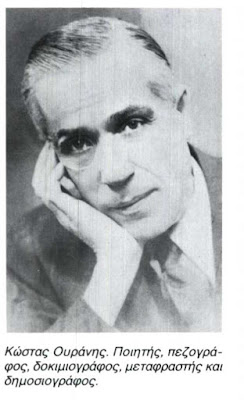 Κώστας Οὐράνης (Λεωνίδιο 1890 - Ἀθήνα 1953): ποιητής, πεζογράφος, μεταφραστὴς καὶ δημοσιογράφος.